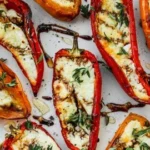 Refrigerate leftovers in an airtight container for up to 3 days. Place a paper towel in the container to absorb moisture and keep peppers crisp. To reheat, preheat the oven to 350°F (175°C) and bake for 8–10 minutes until warmed through; or reheat in an air fryer at 350°F for 4–6 minutes. Freezing is not ideal—the texture of fresh peppers and goat cheese changes, but you can freeze unroasted stuffed peppers on a tray, transfer to a freezer bag, and keep up to 1 month; thaw in the fridge overnight and reheat gently in the oven to avoid separation.